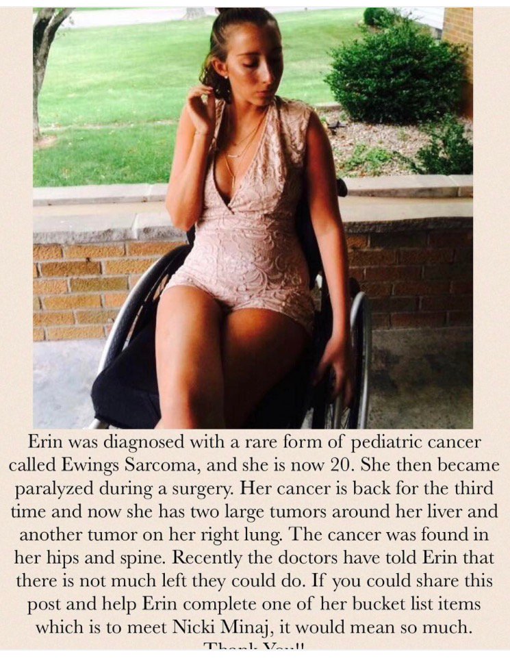 I was supposed to see @NICKIMINAJ pink print tour in 2015 but I missed it to have tumors on my lung & diaphragm removed- Please help us help this brave & inspirational young cancer warrior Erin fulfill her heart's desire to connect w/ @NICKIMINAJ! #BUCKETLIST